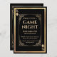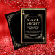 Cette invitation de Game Night présente un design classique de carte de jeu sur un arrière - plan noir. Un cadre de style vintage orné entoure la zone de texte centrale. Un cadre design en feuille d'or assorti borde l'invitation. Deux diamants en or et le monogramme King sont imprimés dans des coins opposés, comme dans un jeu de cartes.