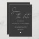 Annoncez votre journée spéciale dans un style intemporel avec cette carte minimaliste Black Save the Date Card. Conçu avec un arrière - plan noir élégant et une calligraphie blanche élégante, il crée une première impression audacieuse mais raffinée pour votre mariage. Parfait pour les couples qui souhaitent un mariage moderne, minimaliste ou à cravate noire, cette carte Save the Date complète tout thème sophistiqué. Entièrement personnalisable avec vos détails, il fait partie de la collection minimaliste de Mariages noirs, y compris les invitations assorties, les cartes RSVP, les menus, les programmes et les tableaux de sièges. Faites connaître à vos invités la date de votre fête avec une carte aussi chic et mémorable que votre grand jour.