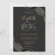 Une aquarelle noire agate design découpée avec parties scintillant faux or apparaît dans deux coins de cet élégant design. Personnalisez-le avec les noms du couple en écriture manuscrite de couleur or sur une grande carte grise. Ajoutez les détails du mariage en cuivre doré et en polices italiques sur un arrière - plan non noir. L'envers est assorti d'un design d'agate noir et or.