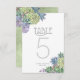 Des polices uniques, des succulentes aquarelles colorées et des fonds scintillants dans un vert printanier doux sont les points forts de ces produits de mariage à assortir. Cette belle carte de numéro de table présente des bordures de coins de feuillage sur fond blanc avec un modèle fourni pour modifier les numéros, les noms des mariés et la date du mariage. Un motif texturé brillant, dans des tons clairs et foncés de vert printanier, ajoute un fond contrasté au verso. Recherchez ID515 pour voir tous les produits correspondants de cet ensemble.