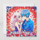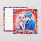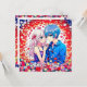Notes de remerciement personnalisées pour votre mariage animé. Des fleurs rouges, bleues et blanches et un mignon couple de dessins animés qui se câlinent.