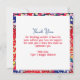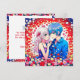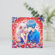 Notes de remerciement personnalisées pour votre mariage animé. Des fleurs rouges, bleues et blanches et un mignon couple de dessins animés qui se câlinent.