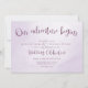 Ce faire-part de mariage de style typographique conçu simplement comprend l'expression "Notre aventure commence" dans un script de style calligraphie lunaire en prune avec des éléments de script coordonnés sur un prune tacheté et un arrière - plan blanc - votre texte personnalisé et le côté inverse de l'invitation correspondent prune - par katz_d_zynes