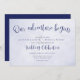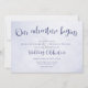 Ce faire-part de mariage de style typographique conçu avec simplicité comporte l'expression "Notre aventure commence" dans un script de style calligraphie bleu foncé avec des éléments de script coordonnés sur un arrière - plan bleu et blanc taché - votre texte personnalisé et l'envers de l'invitation correspondent bleu foncé - par katz_d_zynes