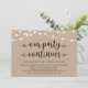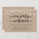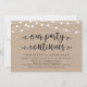 Belles lumières de chaîne de ferme rustique moderne, police de caractères noire sur fond kraft marron, annonce de mariage en fuite, carte d'invitation (Notre fête continue). C'est parfait pour votre réception de mariage et votre fête de célébration après le mariage. Ajoutez vos détails dans la même police / lettrage.