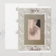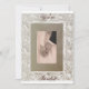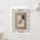 Un design de parchemin beige et ivoire à l'ancienne avec un carton beige où les mariés se tiennent la main et un script élégant en brun foncé disant 'Vous êtes invités' sur le devant et le même script avec la date, l'heure et le lieu au dos. Enveloppes assorties brun foncé et timbres-poste de mariage.