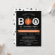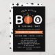 Invitation à la fête d'anniversaire d'Halloween pour un bambin avec Notre Petit Boo écrit en haut avec un citrouille remplaçant un O et un fantôme dansant dans l'autre. Au-dessus vole une chauve-souris parmi les étoiles.