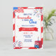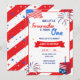 Invitation vos amis et votre famille à la fête d'anniversaire de votre enfant avec Notre Petit Pirate Tourne Une invitation d'anniversaire, conçu par Twin Spirit Designs. L'invitation comprend des feux d'artifice rouges, blancs et bleus, un gâteau, le drapeau américain, des étoiles blanches et dorées, des textes bleus et rouges.