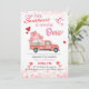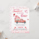 Notre Chérie est une invitation personnalisée Turning One avec un arrière - plan de coeur, un camion de ferme rouge avec ballons roses et du texte rouge et rose.
