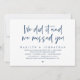 Carte d'invitation d'évasion amoureuse à thème écriture manuscrite bleu marine moderne (Nous l'avons fait et tu nous as manqué). Elle est parfaite pour votre réception d'évasion amoureuse / fête de célébration après le mariage. Ajoutez vos détails dans la même police / lettrage noir.