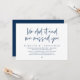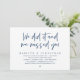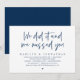 Carte d'invitation de mariage en intime sur le thème Navy Blue Script moderne (Nous l'avons fait et tu nous as manqué). Elle est parfaite pour votre réception de mariage en intime / fête de célébration après le mariage. Ajoutez vos détails dans la même police / lettrage noir.