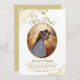 Cette belle invitation de réception de mariage ou de soirée après-mariage comporte un titre élégant en écriture cursive indiquant "Nous l'avons fait !". Elle présente un design simple mais élégant avec des lettres en écriture cursive dorée sur un fond blanc classique, ainsi que votre photo dans un cadre ovale entouré de volutes et de spirales dorées en faux-feuille d'or ouvragées. Parfait pour les mariages en petit comité ou les célébrations qui ont lieu après une cérémonie privée. Une excellente façon d'inviter votre famille et vos amis à célébrer votre amour.