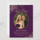 Cette invitation de réception de mariage ou de soirée après-mariage présente un titre élégant en écriture cursive "We Did!". Elle a un design simple mais élégant avec des lettres en écriture cursive dorée sur un fond violet prune profond, et votre photo dans un cadre ovale entouré de volutes et de fioritures en faux foil orné. Parfait pour les mariages en petit comité ou les célébrations qui ont lieu après une cérémonie privée. Une excellente façon d'inviter votre famille et vos amis à célébrer votre amour.