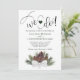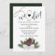 Cette belle faire-part de mariage au design rustique est agrémentée d'un ensemble de pinecones et de branches de pin nouées avec un arc en satin blanc. Le titre est écrit en lettres de script et dit : Nous le faisons! avec un coeur mignon entre les portées. Le dos est une couleur verte de forêt marbrée profonde. Romantique, fantaisiste et élégant, cet invitation est parfait pour un mariage d'hiver, de plein air ou de vacances.