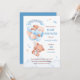 Cette mignonne invitation au Baby shower a le thème "Nous pouvons attendre longtemps". Il présente une illustration molle d'un joyeux bébé ours en peluche flottant avec des ballons. D'autres éléments mignons comme les étoiles, un petit oiseau et des nuages complètent ce design cosy. La palette de couleurs bleu et marron est parfaite pour une maman qui attend un bébé.