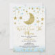 On est sur l'invitation du baby shower de la lune avec une lune de parties scintillant, des étoiles bleues et parties scintillant et un texte de calligraphie faux or. L'invitation comporte aussi une image de papier aquarelle comme arrière - plan.