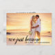 Cette simple mais élégante carte de réception et de faire-part mariage moderne mariée à peine présente votre propre photo avec le sentiment "Nous venons de devenir M. et Mme." sur le devant de la carte avec typographie de script en lettres manuscrites, ainsi que vos noms mariés. Le dos des invitations comporte la même photo avec une superposition transparente et un filtre noir et blanc, et les informations de votre réception de mariage sur le dos. Facile à customiser avec votre propre photo et texte.