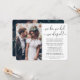 Invitez votre famille et vos amis à une fête post-fuite simplement élégante avec cette invitation élégante et moderne "nous avons fui" comprenant 2 photos. Tout le texte est simple à personnaliser pour n'importe quelle célébration de réception seulement, y compris une fête de 1er anniversaire, une cérémonie de renouvellement de vœux, un mariage séquentiel, un cocktail ou un dîner. Personnalisez-la pour inclure les détails de votre choix, tels que la date du mariage, le code vestimentaire, la RSVP, le site web, etc. (ASTUCE DE PLACEMENT D'IMAGE : Un moyen facile de centrer une photo exactement comme vous le souhaitez est de la rogner avant de la télécharger sur le site Web de Zazzle.) Le design moderne minimaliste noir et blanc présente deux photos du couple nouvellement marié, une calligraphie à l'écriture manuscrite tendance et une typographie élégante de style machine à écrire. Que vous ayez fui en raison de la pandémie de