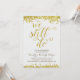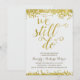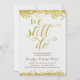Une invitation de fête d'anniversaire de mariage de 50 ans dorée qui présente la phrase romantique "Nous sommes toujours là" écrite en belle calligraphie avec un aspect feuille d'or faux, des confettis dorés faux en haut et en bas de la carte, et un fond gris clair chic.