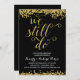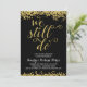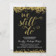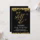 Une invitation de fête d'anniversaire de mariage de 50 ans dorée qui présente la phrase romantique "Nous sommes toujours là" écrite en belle écriture calligraphique avec un aspect de feuille d'or fausse, des confettis dorés faux sur le haut et le bas de la carte, et un fond noir chic.