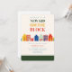 Baby shower neutre avec illustration d'une rangée de maisons à la palette de couleurs rose, bleu, rouge, vert, orange et jaune.