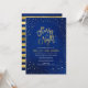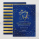 Invitation de bal élégante avec une bordure d'étoiles et les mots "Nuit étoilée" en faux papier doré sur un fond aquarelle bleu vibrant, idéale pour le bal de promo, le bal de rentrée, etc. La carte présente un motif de rayures en faux papier doré sur un fond aquarelle bleu au verso.