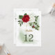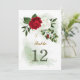 belle carte de numéro de table personnalisable romantique fleurs rouges et blanches avec quelques feuilles verts et parties scintillant d'or carte de numéro de table