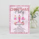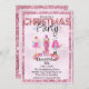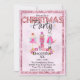 Cette invitation festive personnalisée et festive présente un thème glamour et girly Nutracker. Le mot Noël est imprimé dans des ballons en feuille de sucre de canne de menthe poivrée. L'arrière - plan est une fausse feuille rose bébé avec un cadre de parties scintillant. Une illustration de style aquarelle est imprimée au centre avec des images de couleur pastel de l'histoire du conte de fées The Nutcracker. La fée Sugar Plum est photographiée à gauche du Casse-Noix et le Roi de la Souris est photographié à droite.