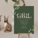 Thème de baby shower de Pâques avec texte "BABY" en rose entouré de végétation eucalyptus, fleurs, lapins et oeufs de Pâques. L'Arrière - plan est vert foncé à l'avant. L'envers est rose.