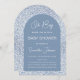 Une invitation au baby shower bleu voûté pour bébé garçon, qui combine l'ancien et le nouveau : une arche bleu moderne sur un motif vintage bleu floral sur arrière - plan blanc. Le titre Oh Boy et le nom sont écrits en script. Le texte est blanc, à l'intérieur de l'arc bleu. L'arrière - plan est un vintage Morris floral bleu du 19ème siècle motif : "Merton" de Kate Faulkner, de 1888, maintenant dans le domaine public.