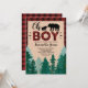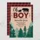 Célébrez votre petit bûcheron avec notre Oh Boy Lumberjack Baby shower Invitation! Cet invitation robuste et charmant présente un design audacieux en plaid de buffle rouge et noir, accompagné d'adorables illustrations d'ours et d'accents de pins, créant le thème boisé parfait pour votre baby shower. BBS288