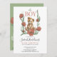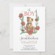 Une jolie invitation au baby shower rustique avec un ours en peluche aquarelle, encerclé par un laurier floral aux fleurs rouges orange et au feuillage vert. Thème "Oh garçon". Le revers de l'invitation affiche une version plus grande du laurier sur un arrière - plan vert plus clair. Disponible en version imprimée, en téléchargement numérique ou les deux.