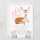 Carte d'invitation baby shower à thème cerf mignonne illustrant une petite fleur de tulipe rose et fausse. Parfait pour une douche de fille au printemps.