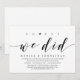 Thème écriture moderne, carte d'invitation de fuite de noces (Oh Oui, Nous L'avons Fait). C'est parfait pour votre célébration décontractée de fuite de noces au bord du lac.