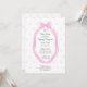 Fêtez l'arrivée de la petite fille avec cette invitation baby shower rose et blanc. Un arc rose et un ruban entourent les détails de l'invitation, tandis que l'arrière - plan est composé de pois roses. Le dos de la carte est muni du même motif à points de polka.