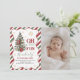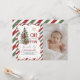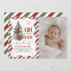 A festive holiday-themed first birthday photo invitation featuring red, green, and white striped borders, elegant Christmas greenery with red bows, and gold snowflake accents. The “Oh What Fun” headline adds a cheerful seasonal touch, paired with space for a personalized baby photo. Perfect for winter or Christmas birthday celebrations, this design is ideal for girls’ first birthdays and customizable with party details.