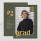 Celebrate a significant academic achievement with this modern, editorial-inspired graduation announcement that doubles as a stylish party invitation. The contemporary design features a modern olive green background with warm golden typography and a clean, refined layout. Easily customize with your favorite photo, the graduate's name, class year, and high school. The reverse side offers a coordinating grad party invitation template, allowing you to seamlessly share all the celebration details. © Kimbellished, LLC