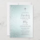 Le bord gauche de cette élégante invitation de première communion moderne comporte une bordure en faux diamant argenté en parties scintillant. Une fausse croix de feuille argent apparaît au-dessus du texte personnalisable, qui combine écriture manuscrite, copperplate et polices italiques en gris sur un arrière - plan sombre et turquoise clair chatoyant. L'envers présente un design correspondant.