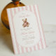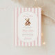 Un doux clin d'oeil à la tradition avec une touche de charme intemporel. Cette petite invitation au baby shower du millénaire présente des rayures d'aquarelle rose douce, un ours en peluche de style vintage, et une typographie élégante — parfaite pour célébrer une petite dame en chemin.