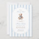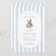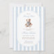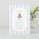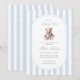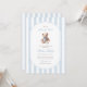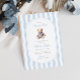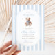 Un doux clin d'oeil à la tradition avec une touche de charme intemporel. Cette petite invitation au baby shower du millénaire présente des rayures d'aquarelle bleu doux, un ours en peluche de style vintage, et une typographie élégante — parfaite pour célébrer un petit gentleman en chemin.