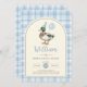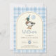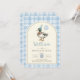 Celebrate your little one's special day with this charming "Lucky Duck" birthday party invitation! Featuring a whimsical illustration of a dapper duck wearing a party hat and holding a pastel blue balloon, this design is framed by a classic plaid border for a touch of retro elegance.
