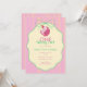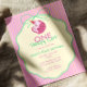 A charming pastel birthday design featuring a sleepy pink cat in a tiny party hat, framed inside a soft cream label with mint green bow details. The pink-and-yellow striped background adds a cheerful retro touch.
