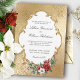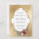 Créez un mariage hivernal inoubliable avec cet élégant design d'invitation de vacances avec un luxuriant spray de roses de Noël, poinsettia, saint et pin, étiquette blanc avec une bordure dorée ornée et un opulent faux métallisé motif damassé dégradé d'or arrière - plan. Inclut une crête d'or personnalisée avec les champs de texte initiaux.