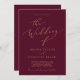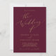 Cet or délicat et bordeaux en un seul faire-part de mariage est parfait pour un mariage moderne. Le design minimaliste romantique présente une belle et élégante typographie de champagne jaune doré sur arrière - plan rouge bordeaux avec un look propre et simple. Enregistrez du papier en incluant les détails au verso du faire-part de mariage plutôt que sur une carte de boîtier séparée. Inclure également les informations RSVP si votre invité répondra par voie électronique (facultatif).