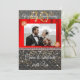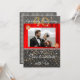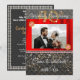 Carton d'invitation chic noir et or avec soie rouge présentant la photographie du couple. L'image est décorée en haut à gauche et en bas à droite d'une broche en diamants or et rouge.