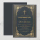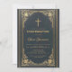 Cette élégante invitation de confirmation avec une atmosphère vintage comporte un cadre doré vintage avec des décorations dorées baroques élégantes sur un fond bleu foncé ressemblant à du cuir. Le nom du garçon est écrit dans une écriture calligraphique élégante. Tout le texte peut être personnalisé et a une couleur dorée similaire aux décorations dorées du cadre.