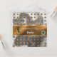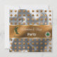 Une élégante invitation orange et argent pailletée avec une lune verte kaki, un charme de perle émeraude dorée, des colliers de cœurs émeraude dorés et des étoiles orange foncé brillantes.