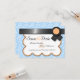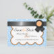 Un beau mariage sauve les dates avec un motif damassé bleu et blanc clair et un ruban noir avec orange au sommet.