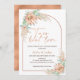 Calligraphie moderne en faux or rose taco 'bout love invitation de baby shower couple dans un style bohème avec un arrangement charmant de cactus orange en fleurs, herbe de pampas et une arche en faux or rose.