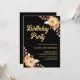 Une invitation d'anniversaire classe et élégante avec une fleur d'orange et un arrangement feuille marron avec typographie or moderne sur un arrière - plan noir.